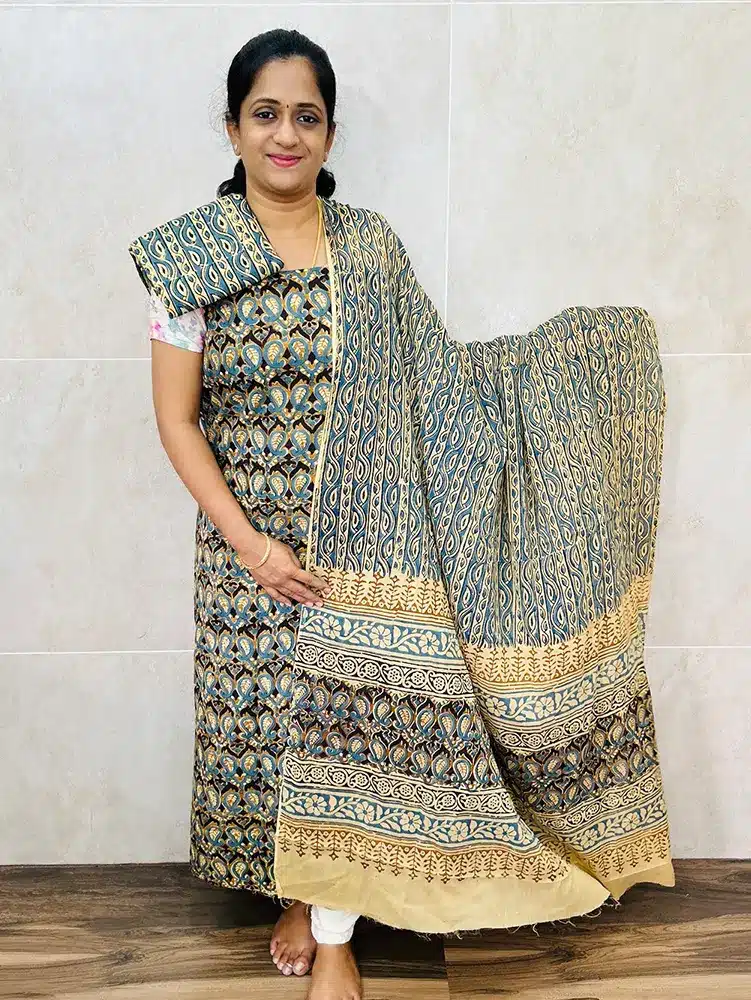 Natural dyed handblock printed cotton top with printed cotton dupatta and cotton bottom