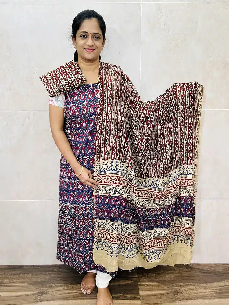 Natural dyed handblock printed cotton top with printed cotton dupatta and cotton bottom