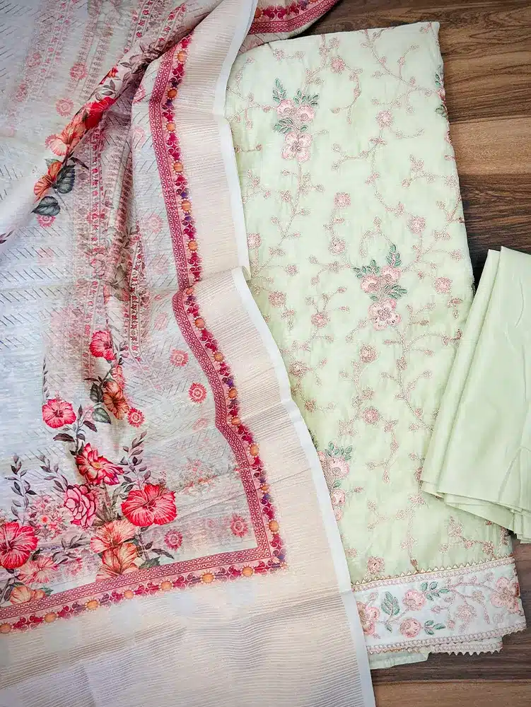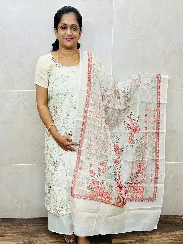 Premium Chanderi silk top with allover embroidery paired with digital printed Benaras silk dupatta cotton silk bottom
