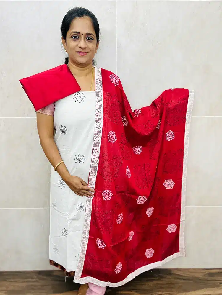 Premium cotton top with allover Kantha stitch paired with a printed cotton dupatta and contrast cotton silk bottom