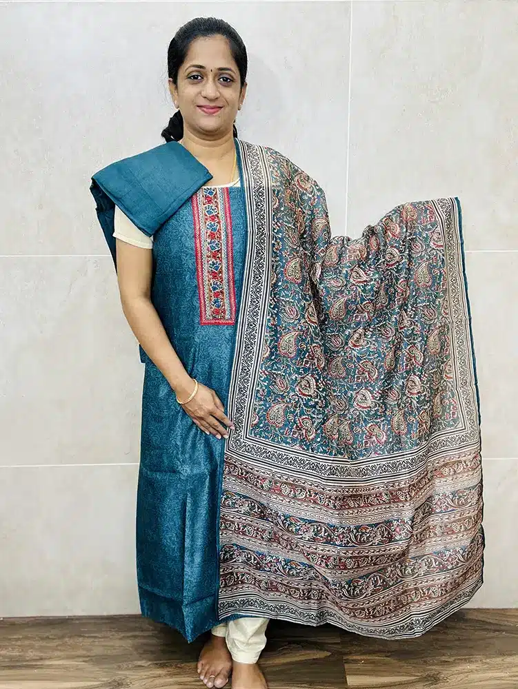 Most of our cotton salwar suits, measurement of the top will be 2.5 meters, dupatta will be from 2.2 to 2.5 meters and bottom will be 2 meters. If you have measurement constraint, please check with us through whatsapp (9176641794) prior booking.