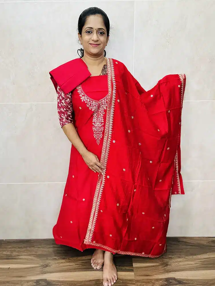 Premium modal silk top with embroidered yoke paired with embroidered soft silk dupatta and cotton silk bottom