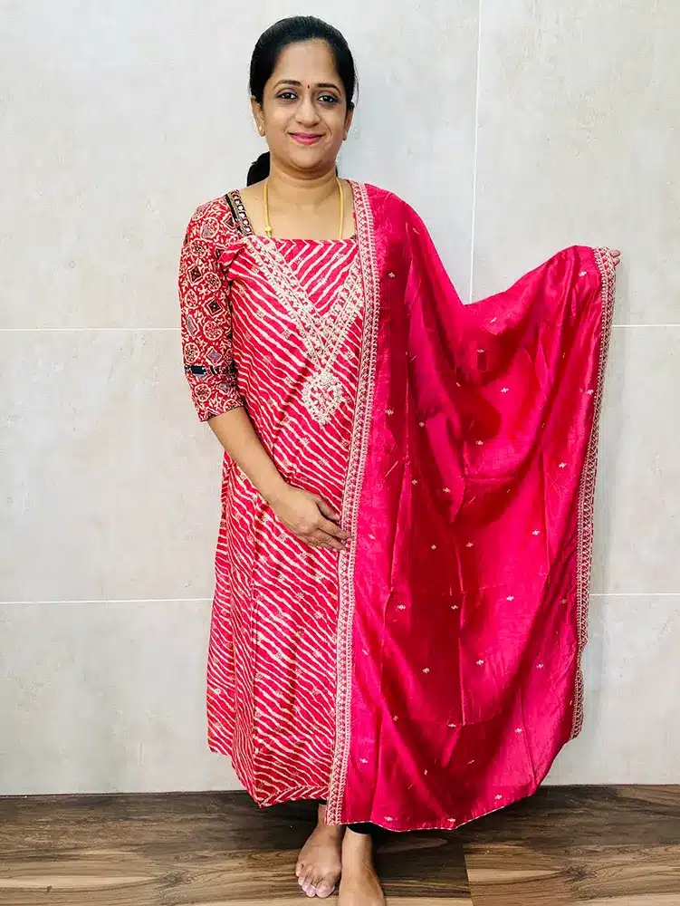 Premium modal silk top with designer neckwork paired with embroidered soft silk dupatta and cotton silk bottom