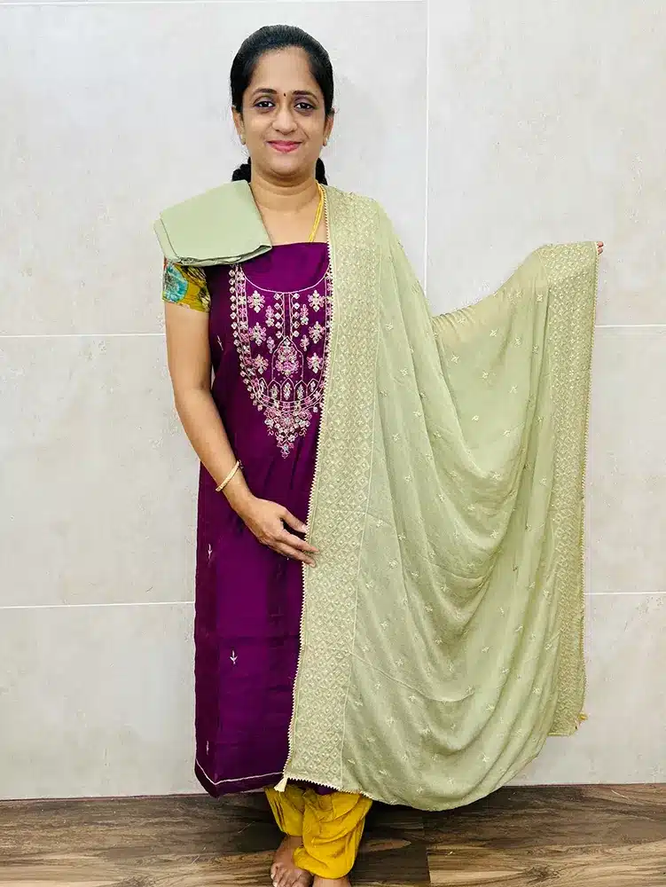 Premium muslin silk top with embroidered Georgette dupatta and cotton bottom