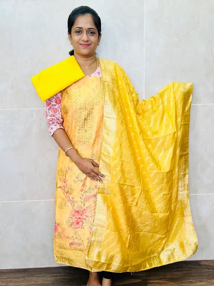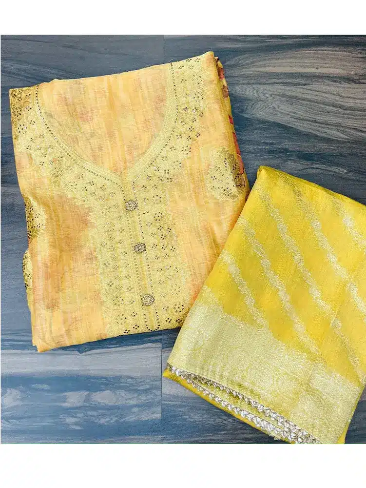 Premium quality soft Chanderi silk top with Benaras weaving, digital prints and swaroski stone work paired with soft Chanderi silk dupatta and silk bottom (lining included)