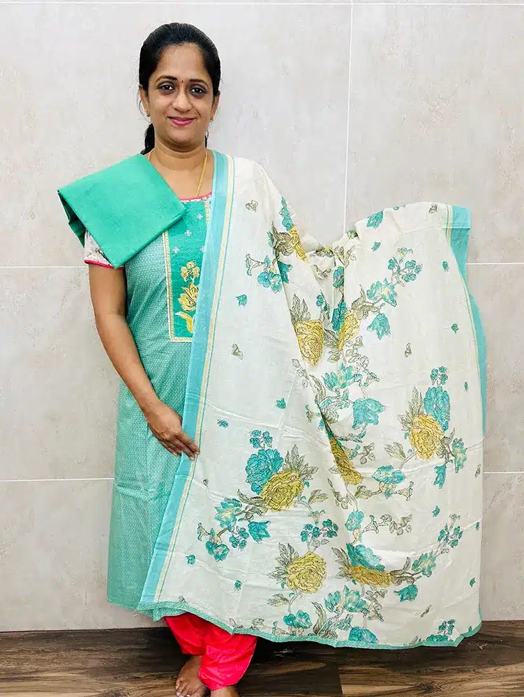 Printed cotton top with patchwork on yoke paired with a printed cotton dupatta and cotton bottom