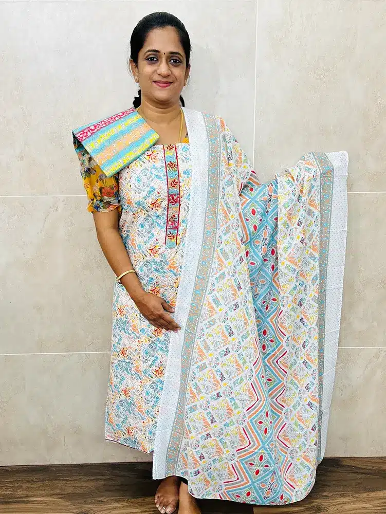 Most of our cotton salwar suits, measurement of the top will be 2.5 meters, dupatta will be from 2.2 to 2.5 meters and bottom will be 2 meters. If you have measurement constraint, please check with us through whatsapp (9176641794) prior booking.