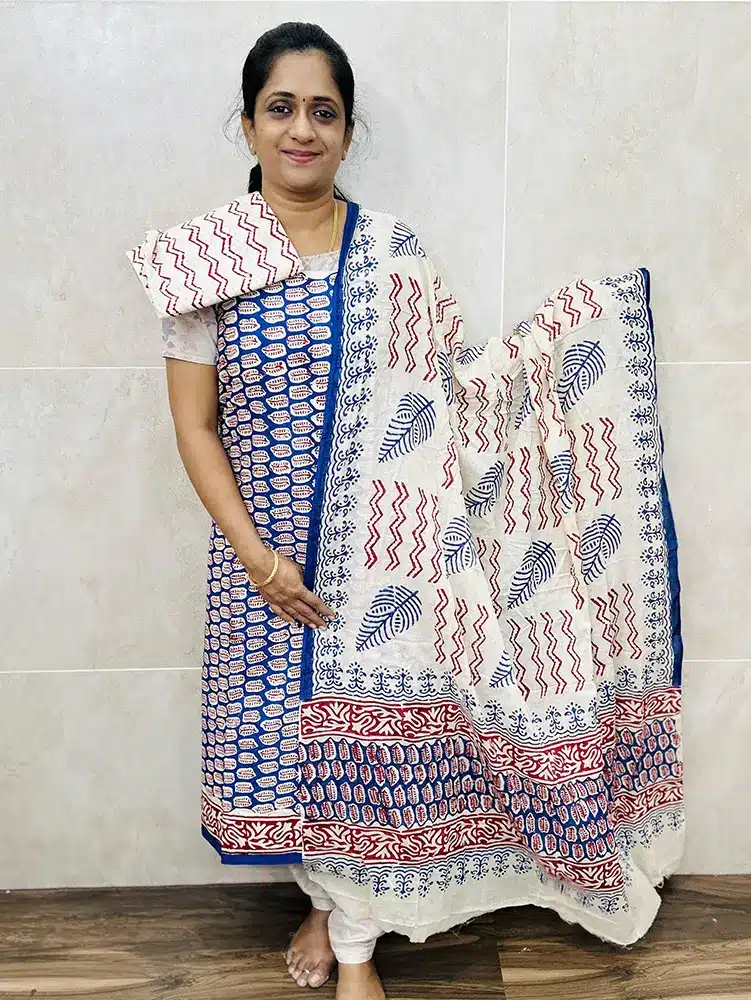 Most of our cotton salwar suits, measurement of the top will be 2.5 meters, dupatta will be from 2.2 to 2.5 meters and bottom will be 2 meters. If you have measurement constraint, please check with us through whatsapp (9176641794) prior booking.