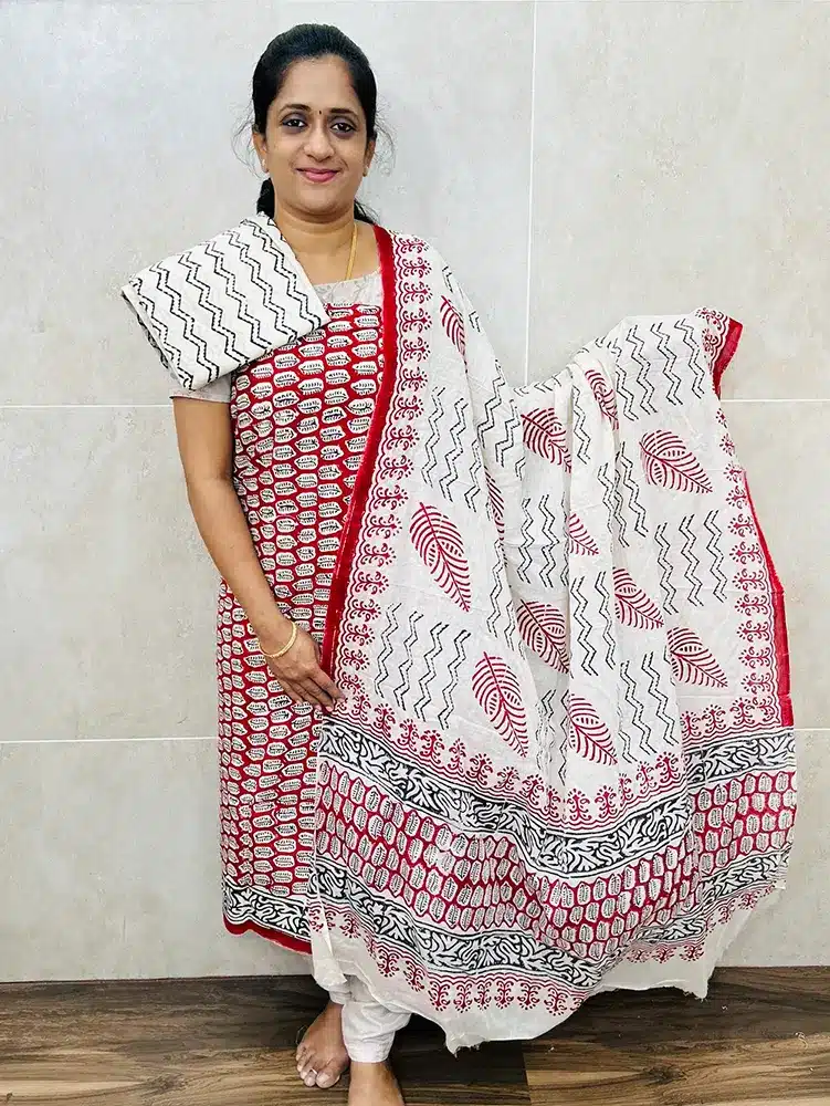 Most of our cotton salwar suits, measurement of the top will be 2.5 meters, dupatta will be from 2.2 to 2.5 meters and bottom will be 2 meters. If you have measurement constraint, please check with us through whatsapp (9176641794) prior booking.