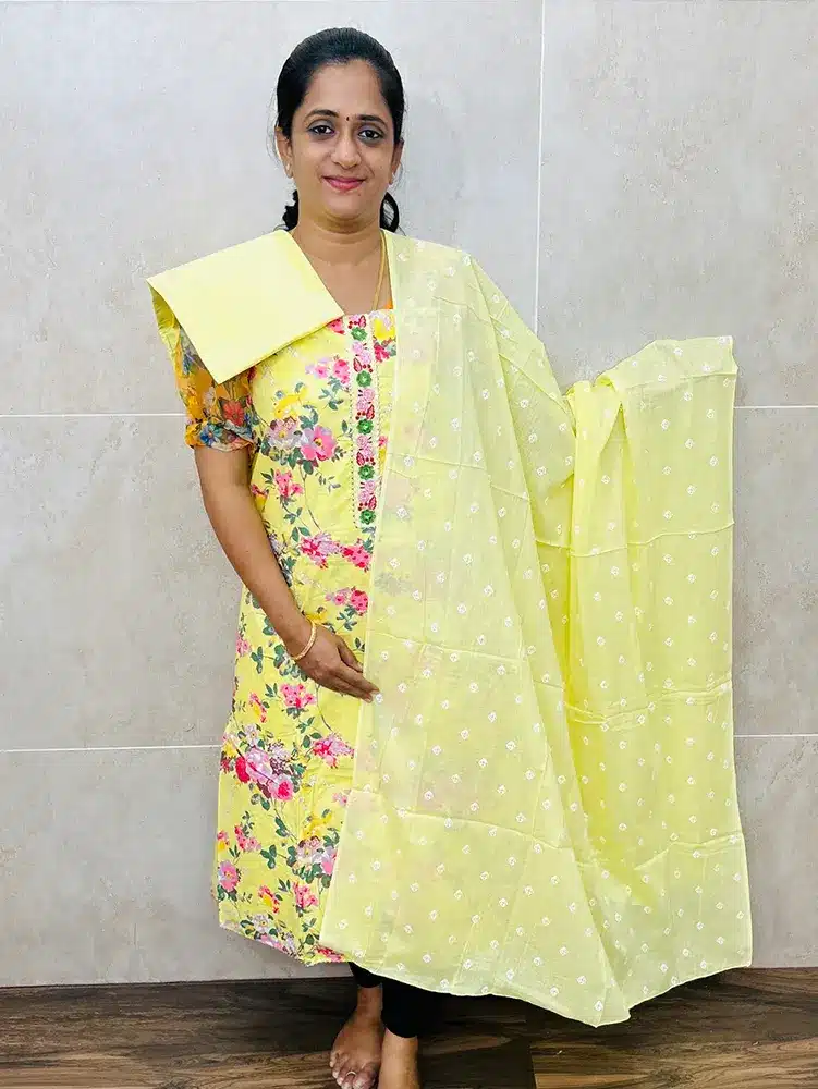 Most of our cotton salwar suits, measurement of the top will be 2.5 meters, dupatta will be from 2.2 to 2.5 meters and bottom will be 2 meters. If you have measurement constraint, please check with us through whatsapp (9176641794) prior booking.