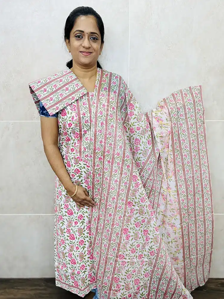 Printed Jaipur cotton top paired with a printed cotton dupatta and cotton bottom