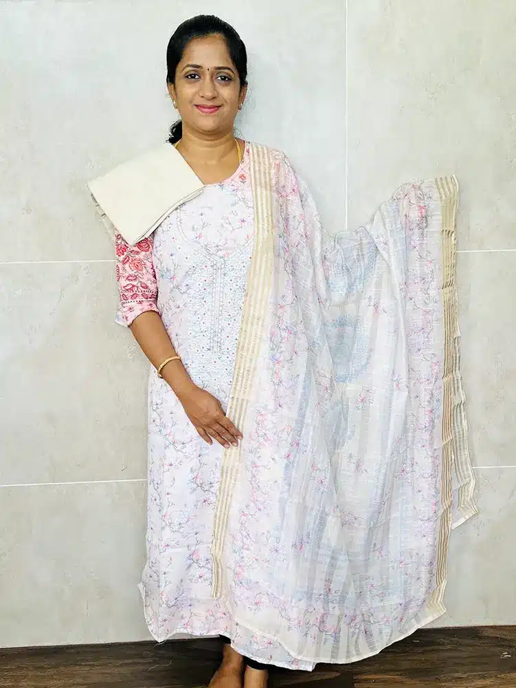Most of our cotton salwar suits, measurement of the top will be 2.5 meters, dupatta will be from 2.2 to 2.5 meters and bottom will be 2 meters. If you have measurement constraint, please check with us through whatsapp (9176641794) prior booking.