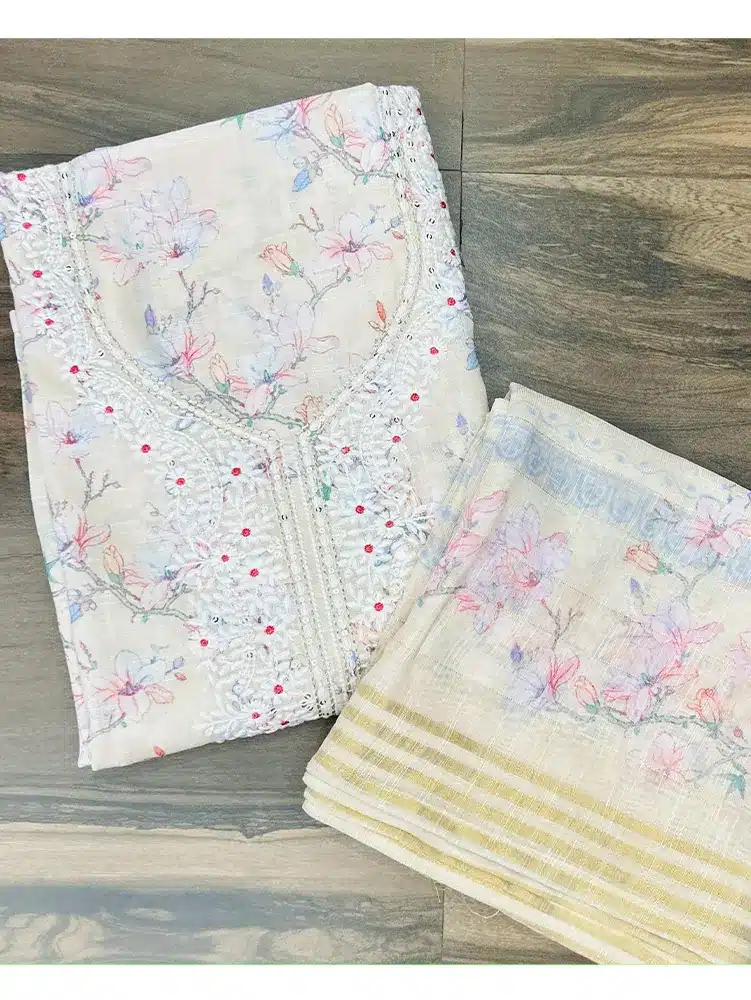 Printed linen cotton top with embroidered yoke paired with printed cotton dupatta and cotton bottom