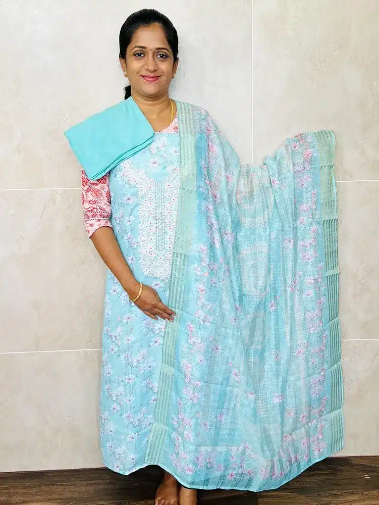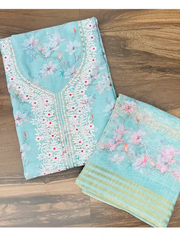 Printed linen cotton top with embroidered yoke paired with printed cotton dupatta and cotton bottom