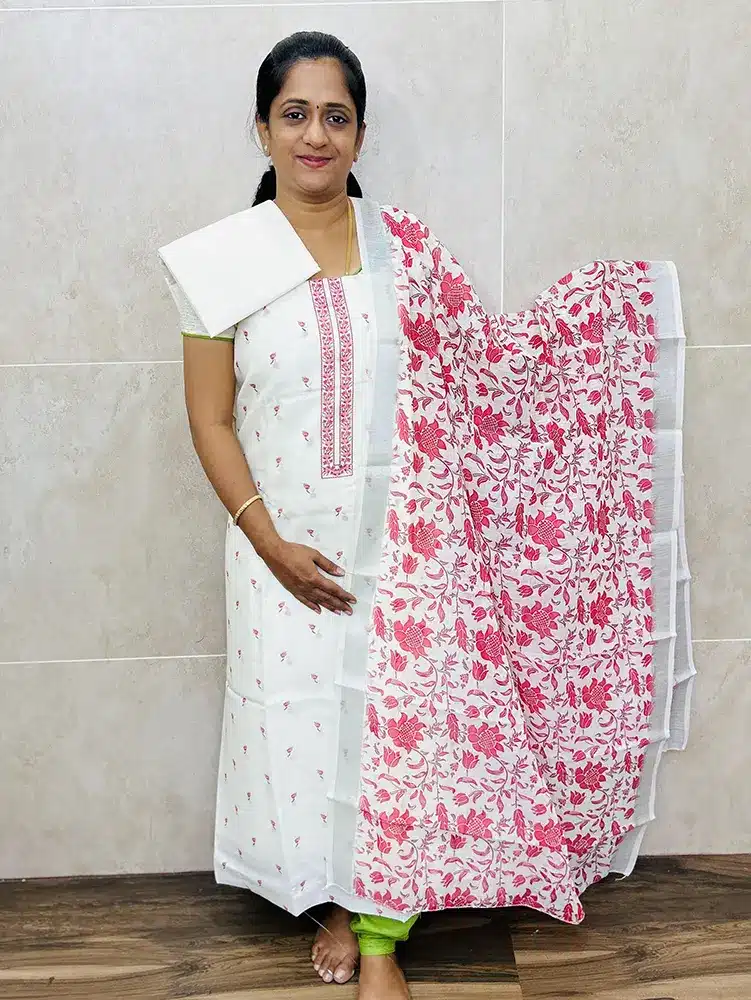 Most of our cotton salwar suits, measurement of the top will be 2.5 meters, dupatta will be from 2.2 to 2.5 meters and bottom will be 2 meters. If you have measurement constraint, please check with us through whatsapp (9176641794) prior booking.