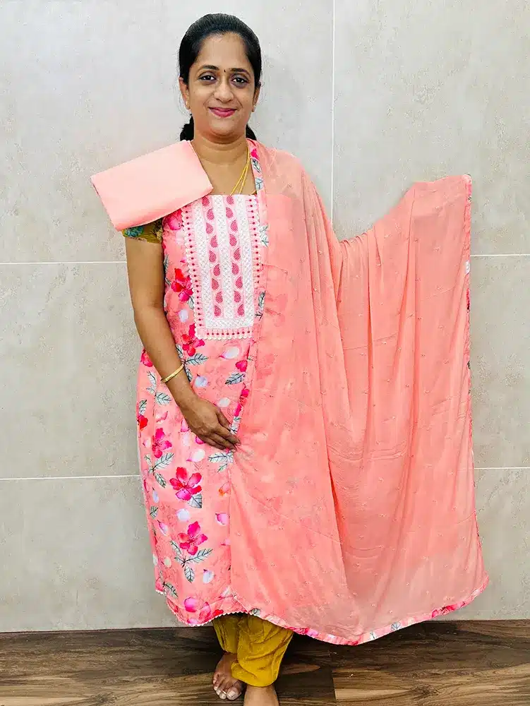 Printed linen cotton top with embroidered chiffon dupatta and cotton bottom