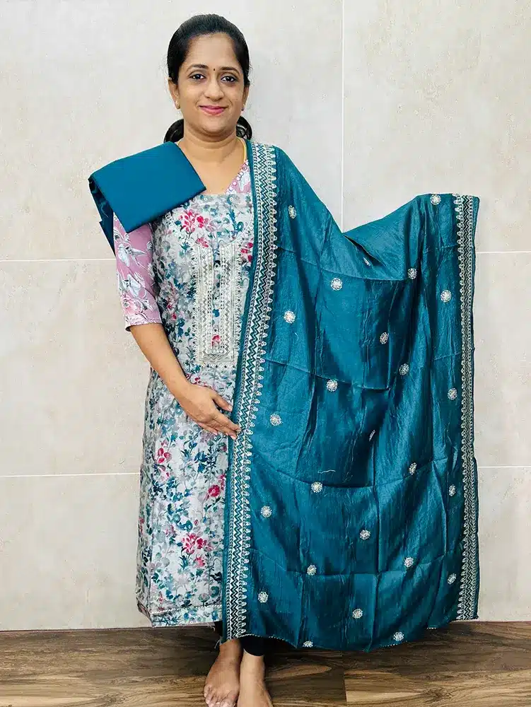 Most of our cotton salwar suits, measurement of the top will be 2.5 meters, dupatta will be from 2.2 to 2.5 meters and bottom will be 2 meters. If you have measurement constraint, please check with us through whatsapp (9176641794) prior booking.