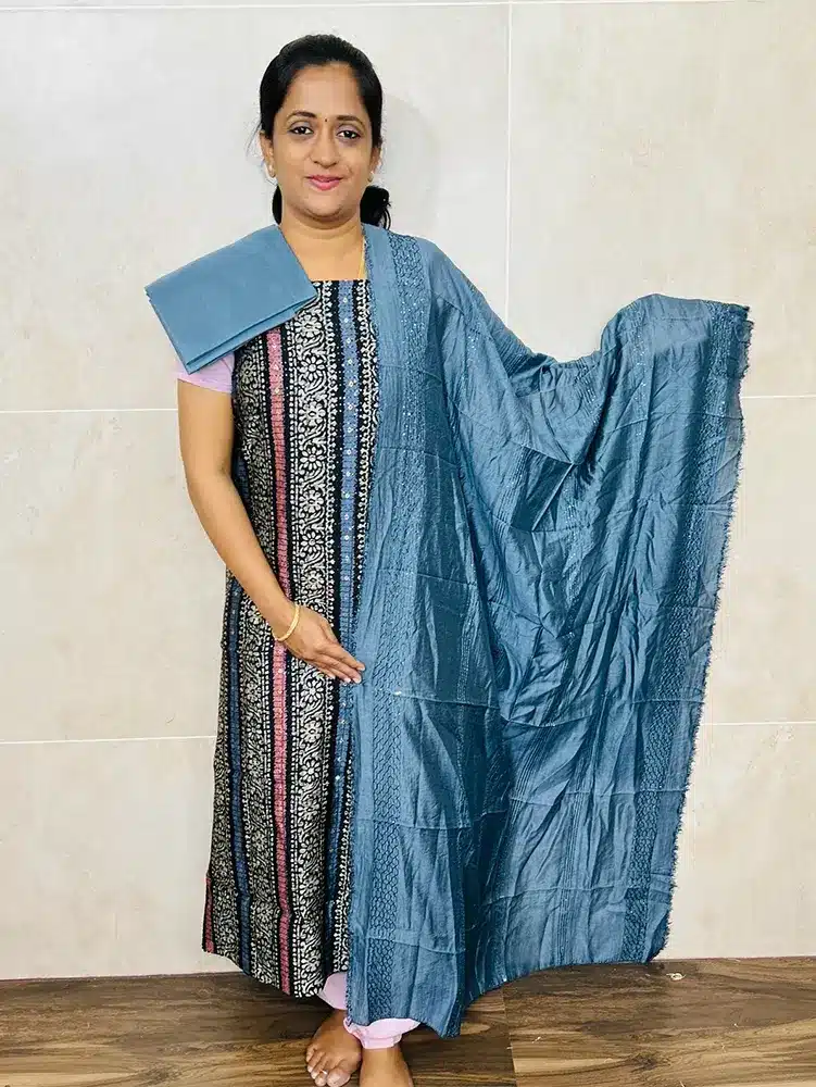 Most of our cotton salwar suits, measurement of the top will be 2.5 meters, dupatta will be from 2.2 to 2.5 meters and bottom will be 2 meters. If you have measurement constraint, please check with us through whatsapp (9176641794) prior booking.