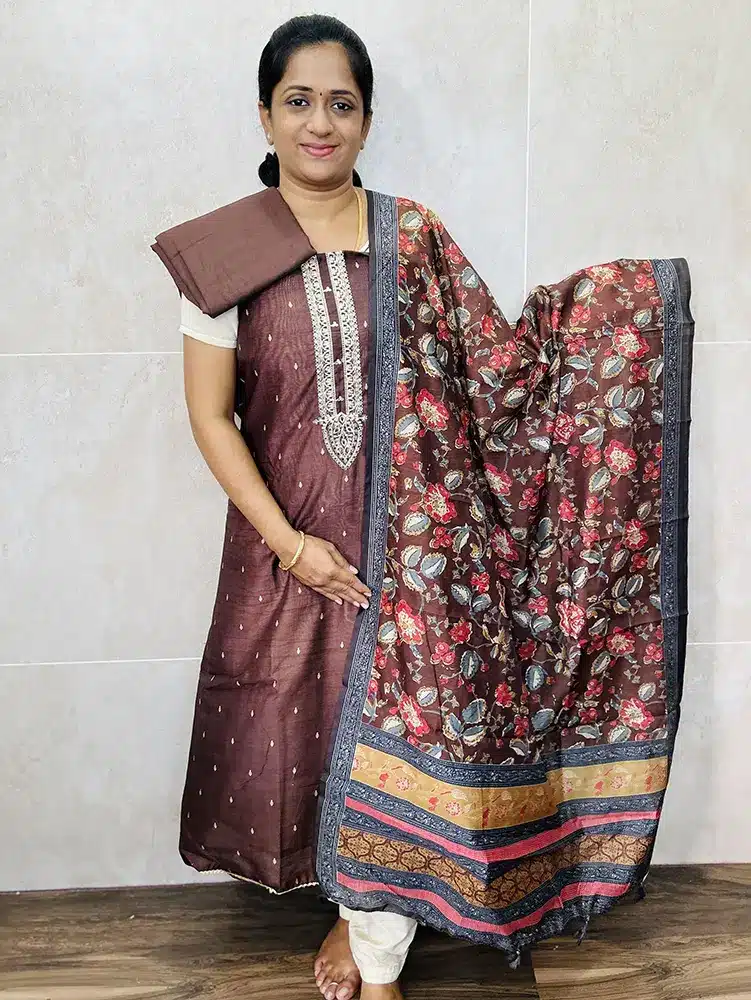 Printed soft Chanderi silk top with embroidered yoke paired with printed soft Chanderi silk dupatta and cotton silk bottom