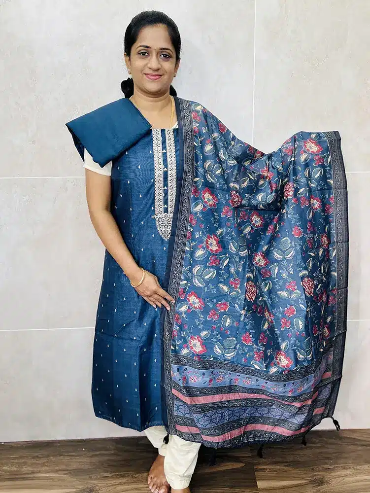 Most of our cotton salwar suits, measurement of the top will be 2.5 meters, dupatta will be from 2.2 to 2.5 meters and bottom will be 2 meters. If you have measurement constraint, please check with us through whatsapp (9176641794) prior booking.