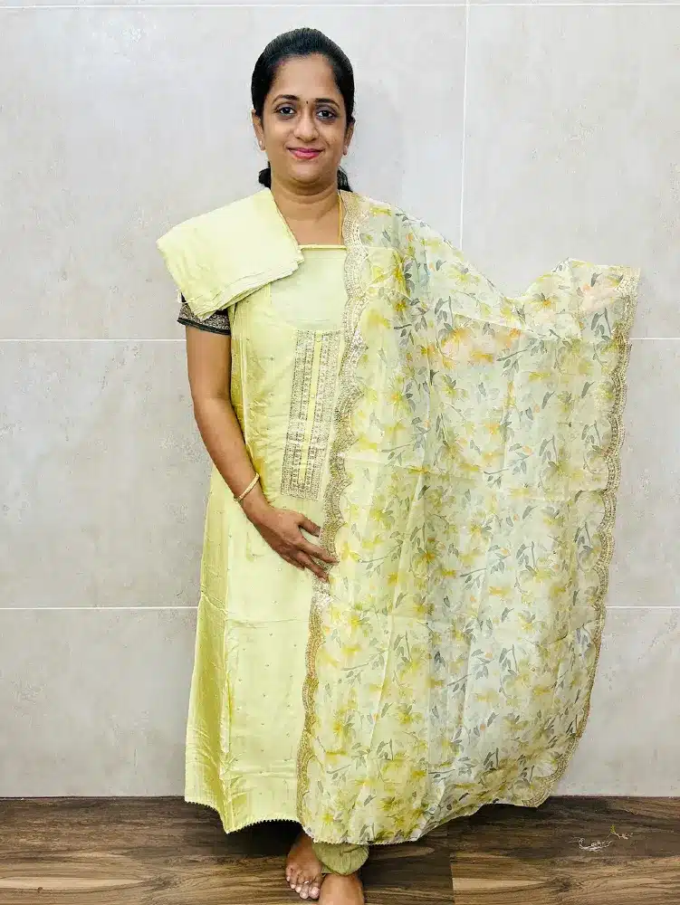 Pure dola silk top with simple embroidered yoke paired with printed pure organza dupatta and cotton silk bottom