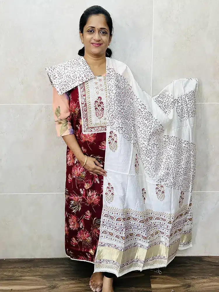 Rayon cotton top with printed soft silk dupatta and printed cotton bottom