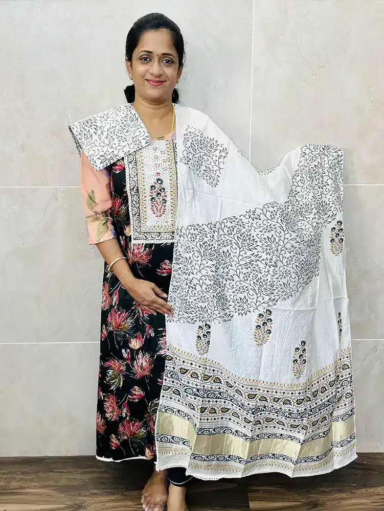 Rayon cotton top with printed soft silk dupatta and printed cotton bottom