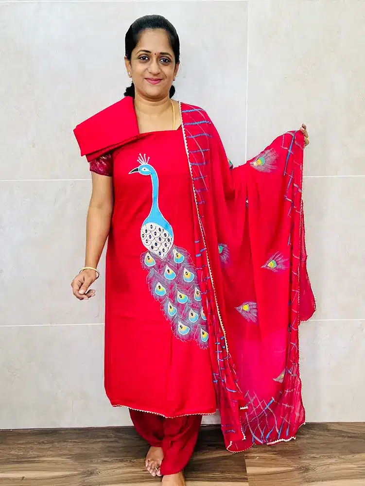 Most of our cotton salwar suits, measurement of the top will be 2.5 meters, dupatta will be from 2.2 to 2.5 meters and bottom will be 2 meters. If you have measurement constraint, please check with us through whatsapp (9176641794) prior booking.