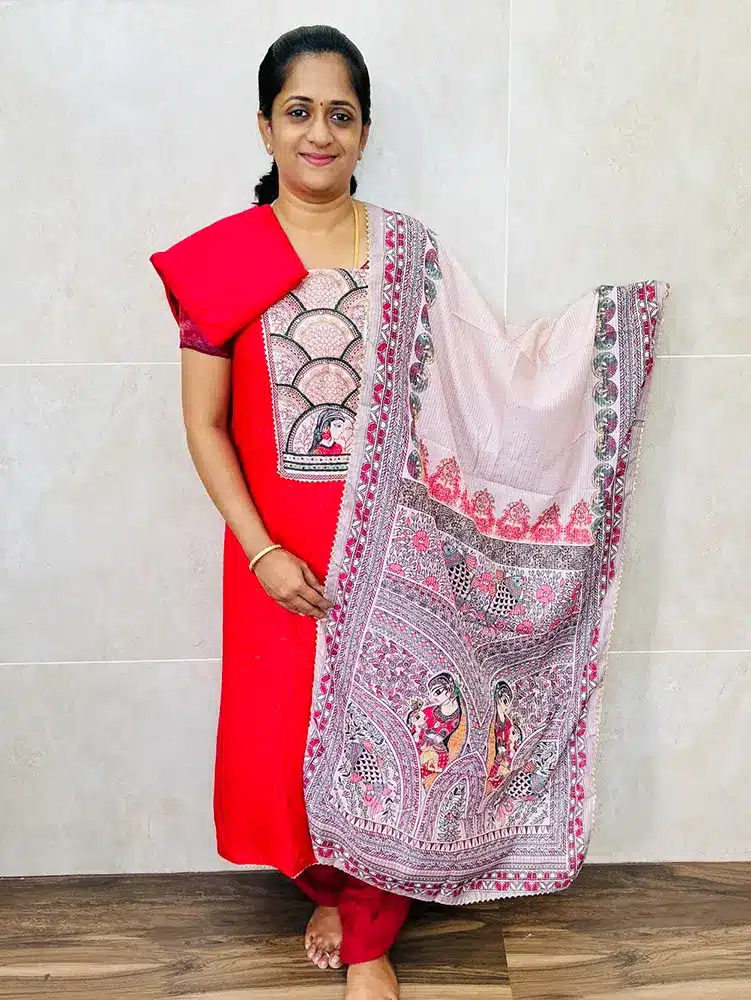 Rayon top with madhubhani patchwork on yoke paired with printed soft silk dupatta and rayon bottom