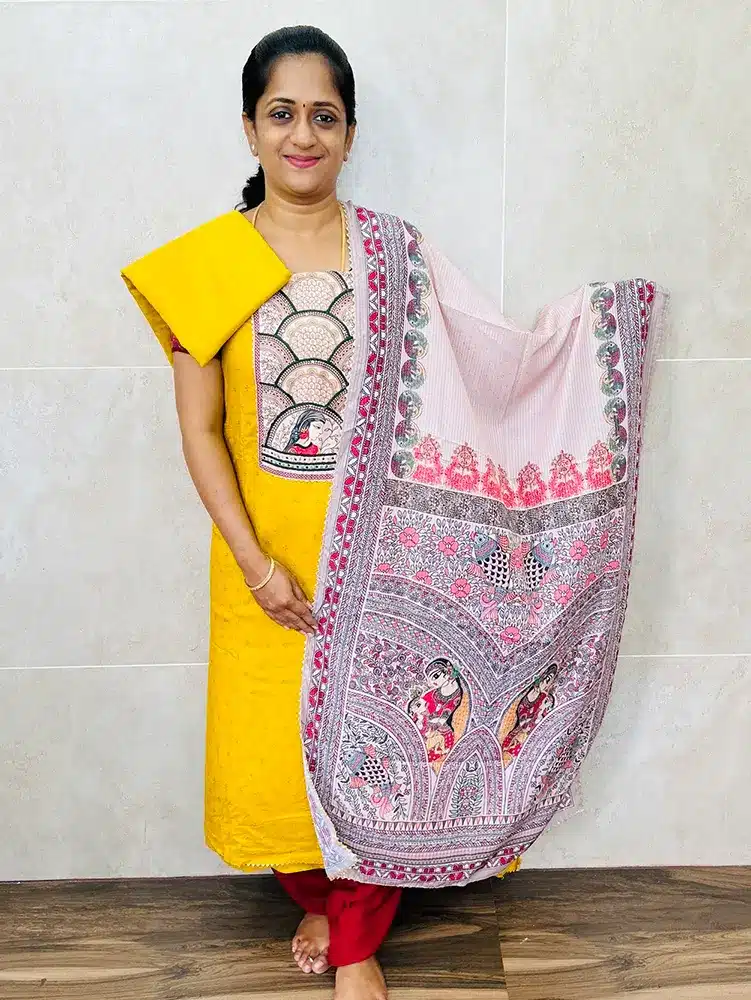 Rayon top with madhubhani patchwork on yoke paired with printed soft silk dupatta and rayon bottom