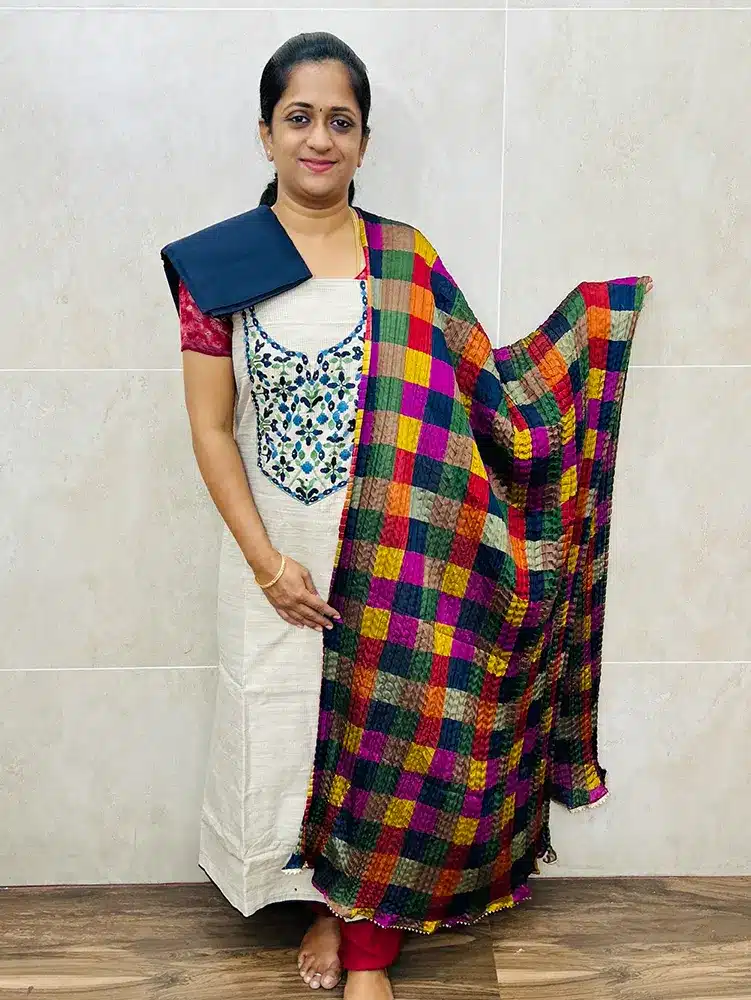 Semi Jute cotton top with embroidered yoke paired with crush silk dupatta and cotton bottom