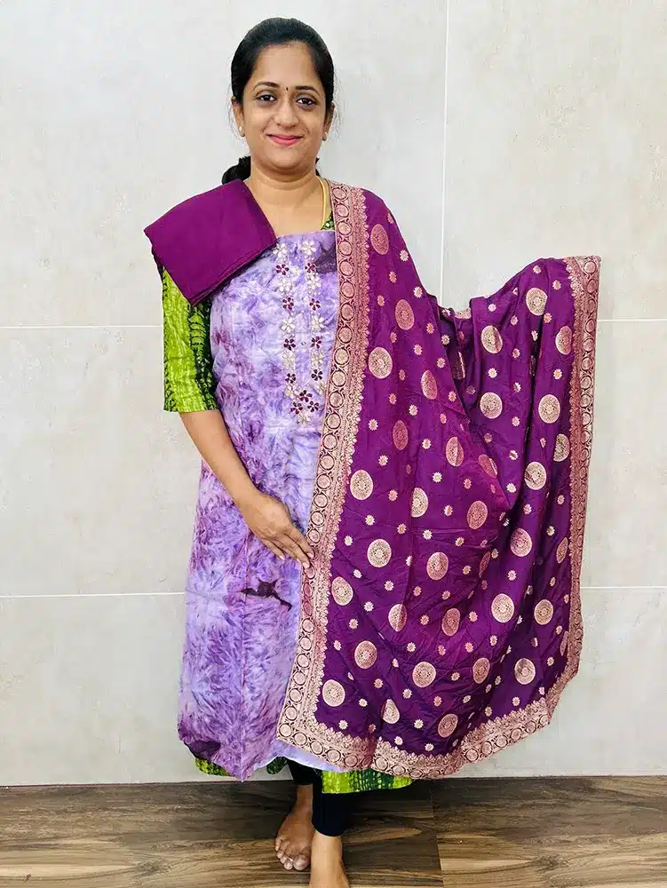 Shibori dyed soft silk top paired with Benaras weaved soft silk dupatta and cotton silk bottom