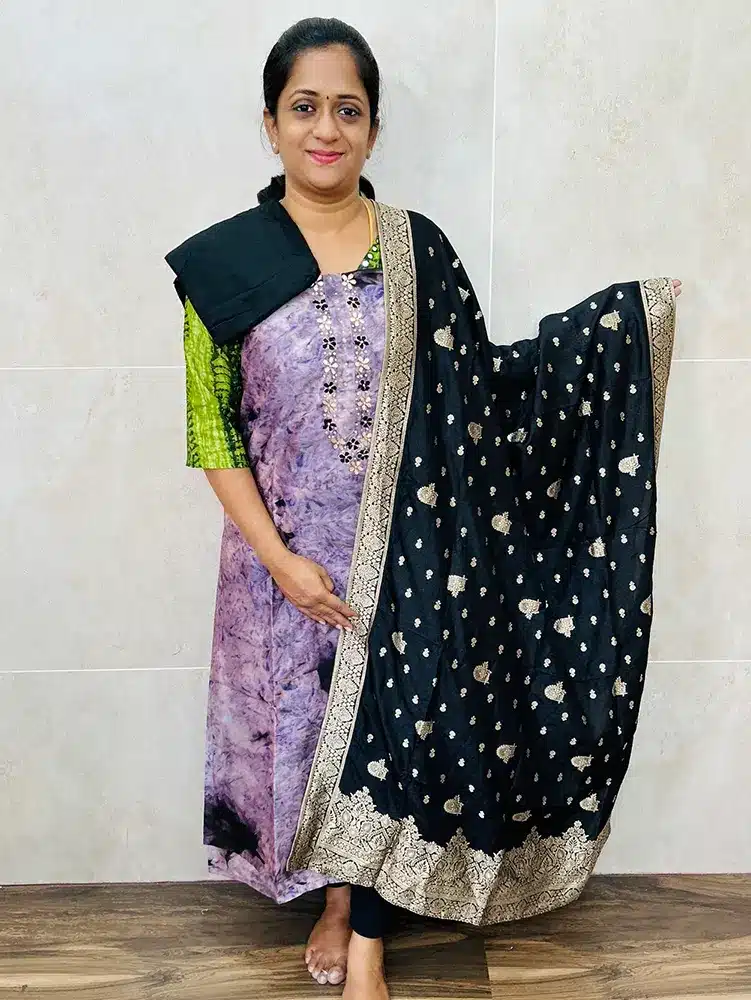 Shibori dyed soft silk top paired with Benaras weaved soft silk dupatta and cotton silk bottom