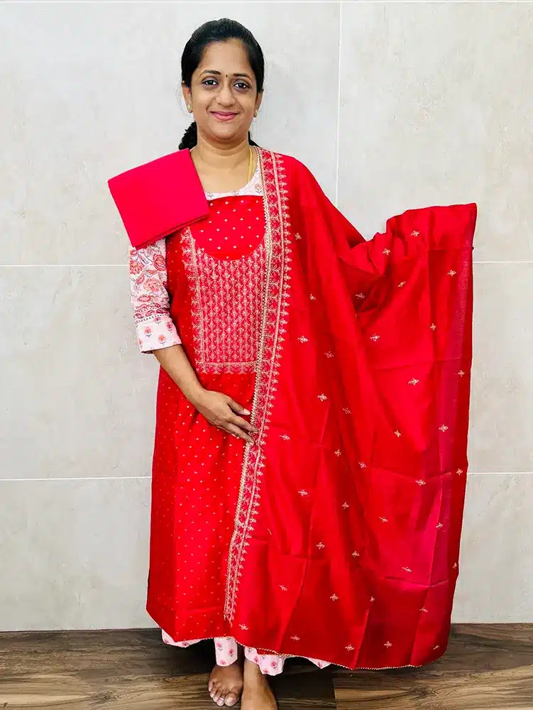 Soft Chanderi silk top with embroidered yoke paired with embroidered soft silk dupatta and cotton bottom