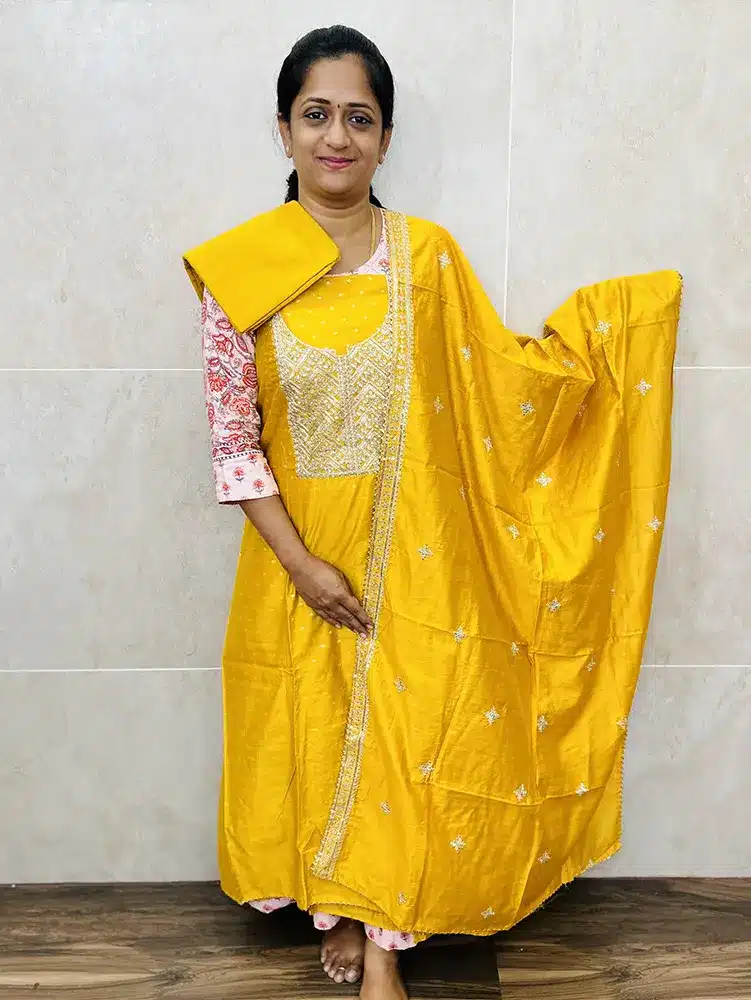 Soft Chanderi silk top with embroidered yoke paired with embroidered soft silk dupatta and cotton bottom