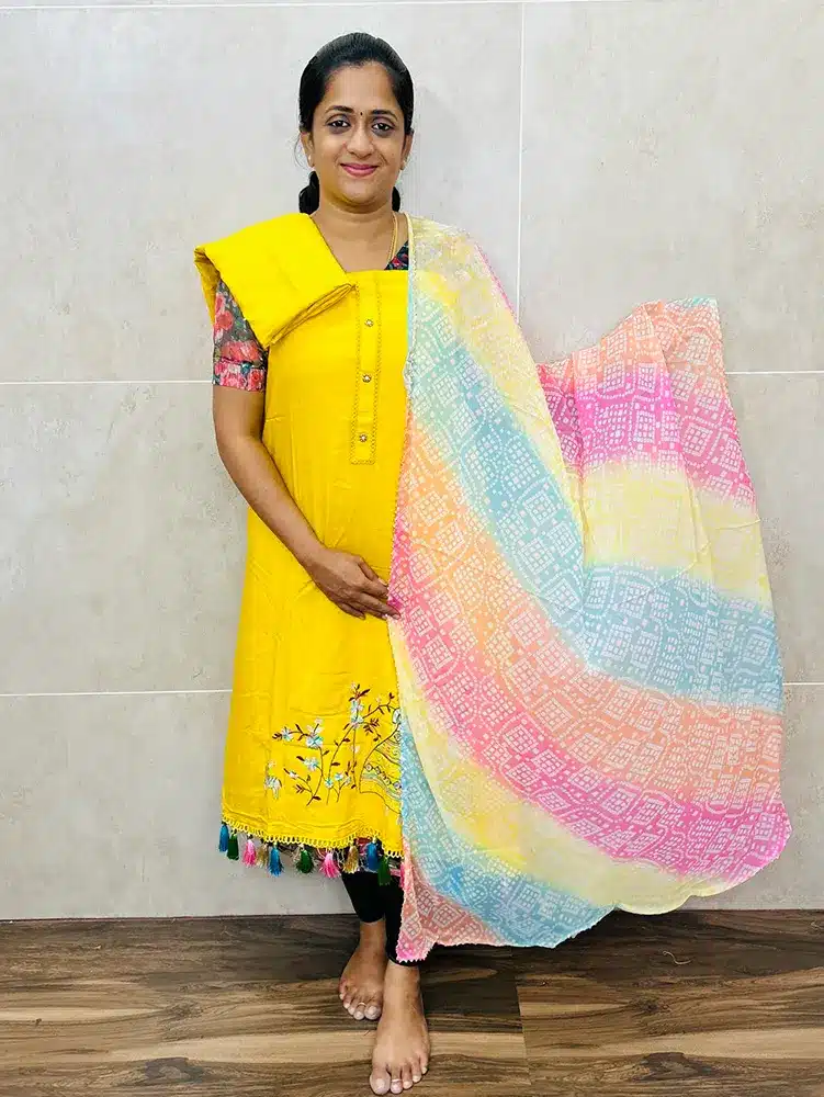 Soft cotton top with beautiful and unique embroidery paired with printed chiffon dupatta and soft cotton bottom