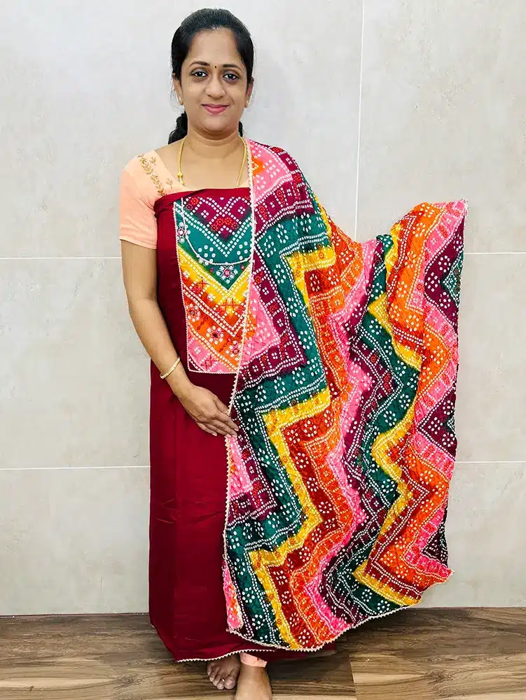 Soft Cotton top with mirror worked bhandini patch work on yoke paired with bhandini silk dupatta and rayon bottom