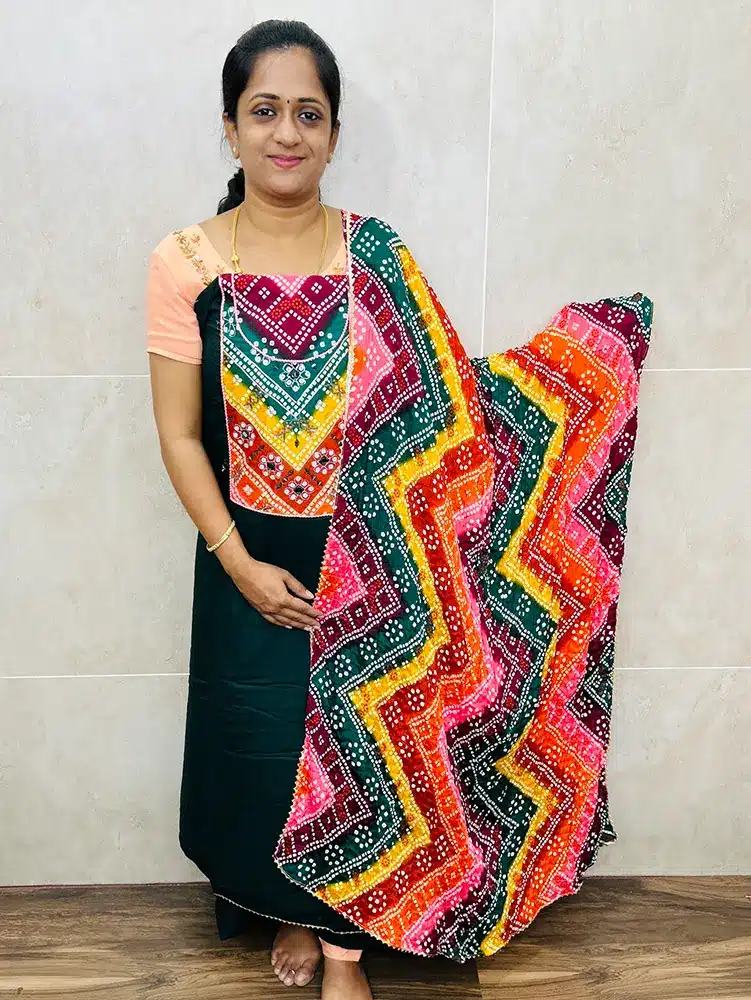 Soft Cotton top with mirror worked bhandini patch work on yoke paired with bhandini silk dupatta and rayon bottom