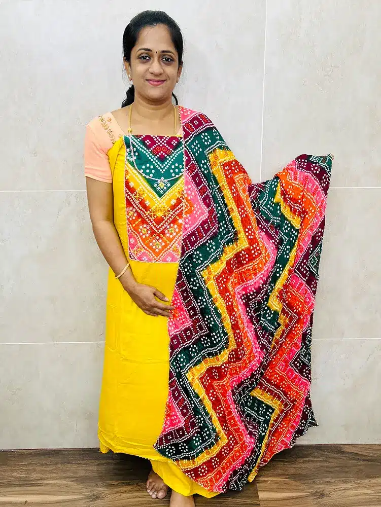 Soft Cotton top with mirror worked bhandini patch work on yoke paired with bhandini silk dupatta and rayon bottom