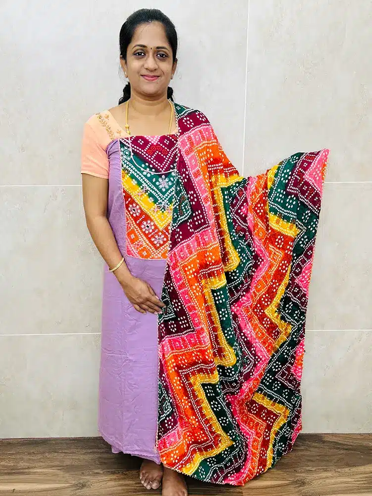 Soft Cotton top with mirror worked bhandini patch work on yoke paired with bhandini silk dupatta and rayon bottom