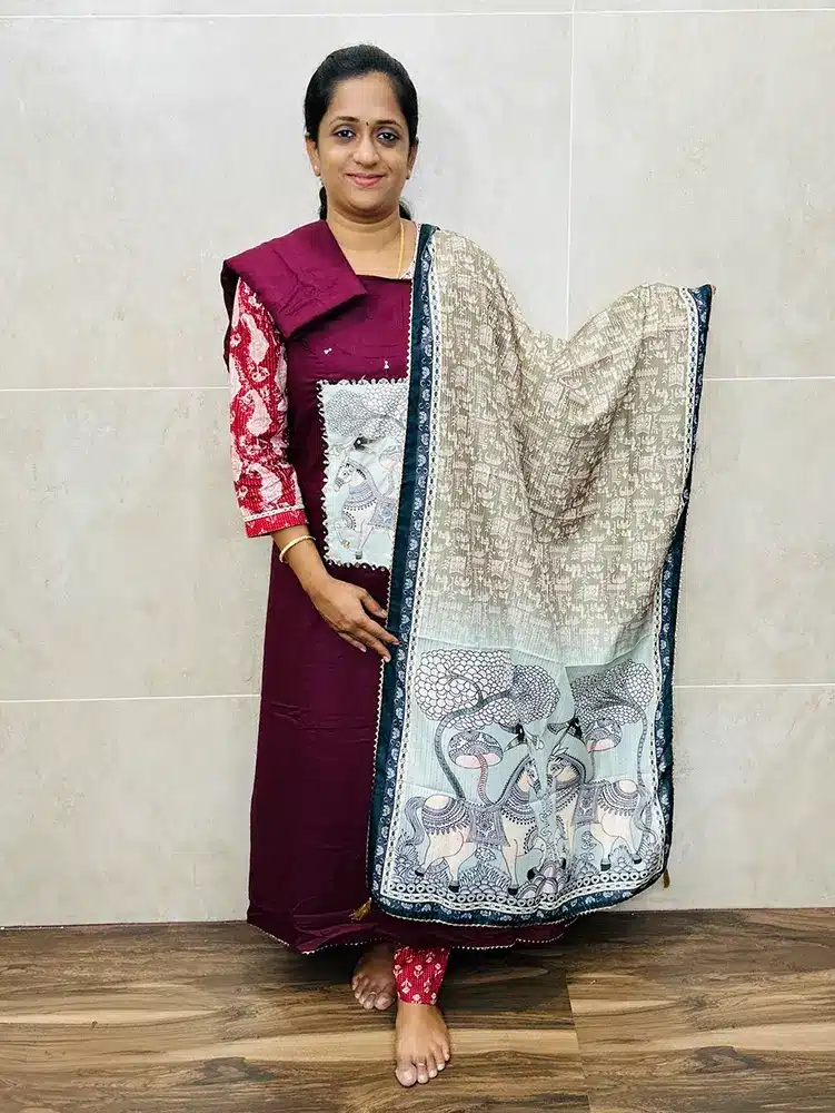 Soft cotton top with muslin silk patch work paired with soft silk dupatta and cotton bottom