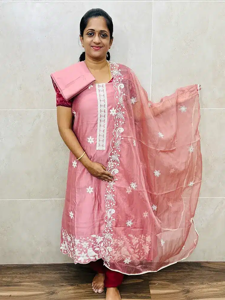 Soft modal silk with embroidered buttas paired with embroidered organza dupatta and modal silk bottom
