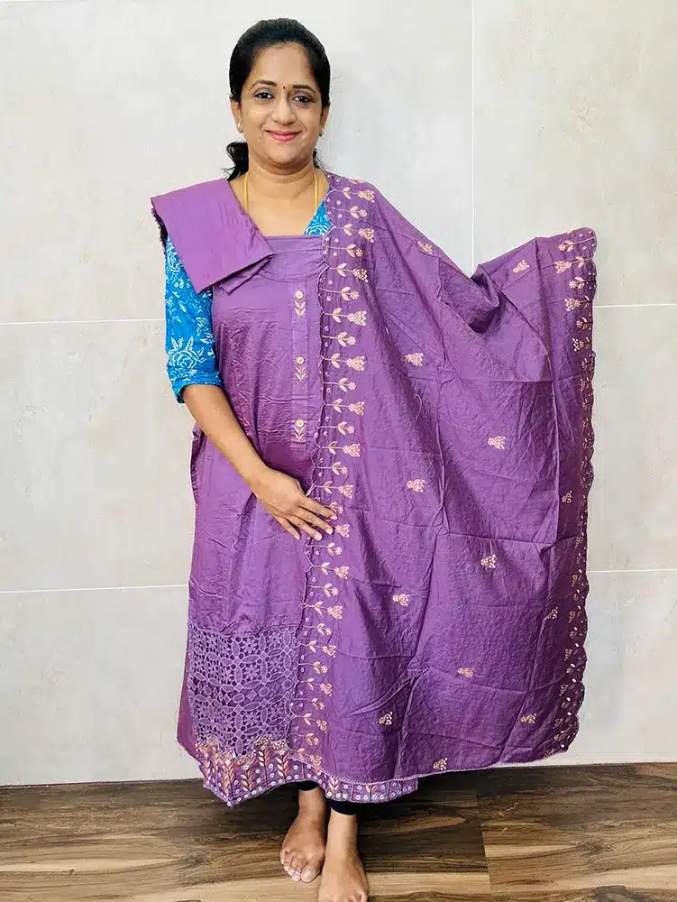 Most of our cotton salwar suits, measurement of the top will be 2.5 meters, dupatta will be from 2.2 to 2.5 meters and bottom will be 2 meters. If you have measurement constraint, please check with us through whatsapp (9176641794) prior booking.